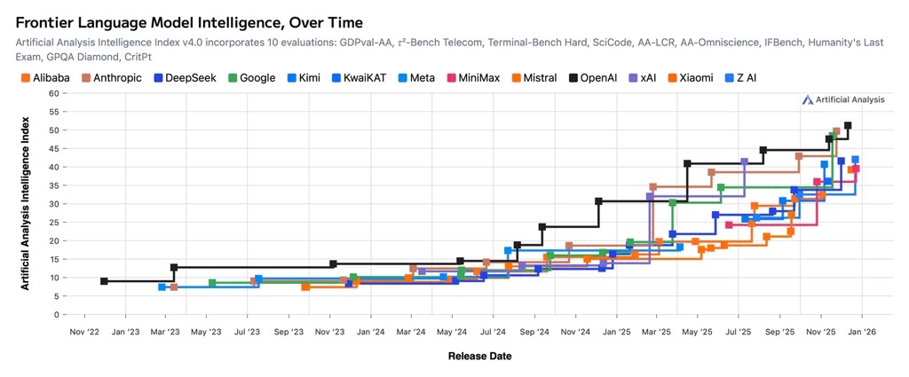 Chart: Artificial Analysis Intelligence Index v4.0 — showing capability convergence across providers from Nov 2022 to Jan 2026. Note how DeepSeek (green), Google (blue), and others have caught up to OpenAI (black) by early 2026.